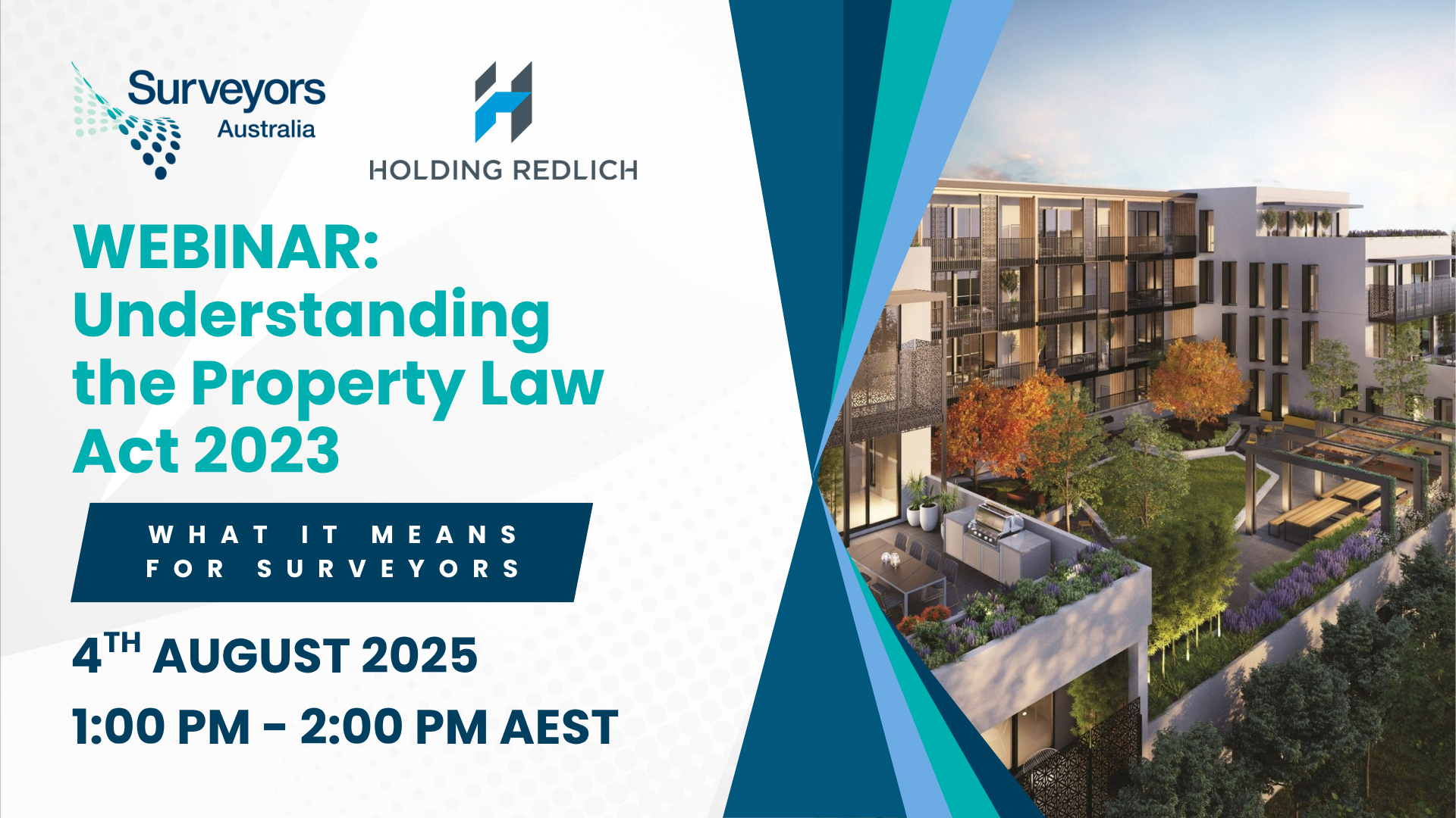 This webinar will help surveyors working in Queensland understand how the new Property Law Act 2023 impacts their work—from new disclosure requirements to changes in off-the-plan developments and strata schemes—so you can confidently support your clients and stay compliant. Presented by Holding Redlich 1 SP available - $50 members, $90 non-members